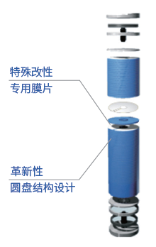 其核心結構為特殊改性的專用膜片和革新性導流盤,膜片與導流盤的間歇部分為進水的敞開式通道,導流盤上的凹槽是滲透水的流道。