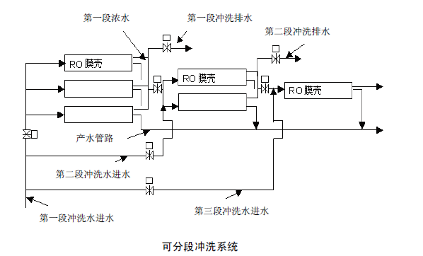 對于多段反滲透系統,為了能夠更有效的沖洗膜元件,系統的設計有必要按可以分段沖洗進行設計。反滲透分段沖洗的優點有: