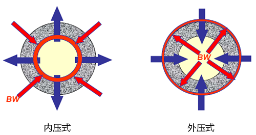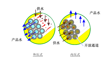 內壓式膜的進水流道是中空纖維的內腔,為防止堵塞,對進水的顆粒粒徑和含量都有較嚴格的限制,因而適合于原水水質較好的工況。而且內壓式則不能或者不建議采用氣擦洗方式,往往必須采用頻繁的化學加強反洗或化學清洗來緩解污染的問題。