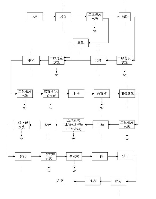 陽(yáng)極氧化生產(chǎn)線工藝流程及產(chǎn)排廢水(W)示意圖