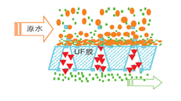 超濾是一種膜分離技術,其膜為多孔性不對稱結構。過濾過程是以膜兩側壓差為驅動力,以機械篩分原理為基礎的一種溶液分離過程,使用壓力通常為0.1~0.3MPa,篩分孔徑為0.005~0.1μm,截留分子量為1000~500,000道爾頓左右。溶解物質和比膜孔徑小的物質將能作為透過液透過膜濾,不能透過濾膜的物質被慢慢濃縮于排放液中。因此產水(透過液)將含有水、離子和小分子量物質,而膠體物質、顆粒、細菌、病毒和原生動物將被超濾膜去除。